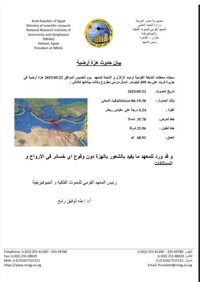 حسب ما ذكرته المعهد القومي للبحوث الفلكية والجيوفيزيقية، فإن الهزة الأرضية التي شعر بها البعض في مصر، تعود إلى زلزال ضرب جزيرة كريت في اليونان بقوة بلغت 6.24 درجة على مقياس ريختر، وجاء عبر البيان بأن الزلزال وقع في تمام الساعة 6:29 صباحًا بتوقيت القاهرة، على بُعد 79 كيلومترًا شمال شرق مدينة هيراكليون.