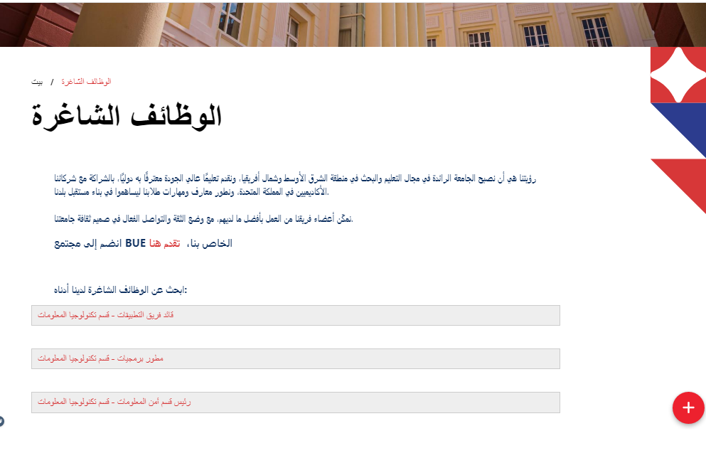 وظيفة جامعة .. أعلنت الجامعة البريطانية في مصر (BUE) عن فتح باب التقديم لشغل عدد من الوظائف الشاغرة في مختلف الكليات والأقسام الإدارية، في خطوة تهدف إلى دعم بيئة التعليم العالي وتوفير كوادر أكاديمية وإدارية على أعلى مستوى من الكفاءة. ويُعد هذا الإعلان فرصة ذهبية للباحثين عن وظائف في مجال التعليم الجامعي والإدارات المساندة في واحدة من أبرز الجامعات الخاصة في مصر.