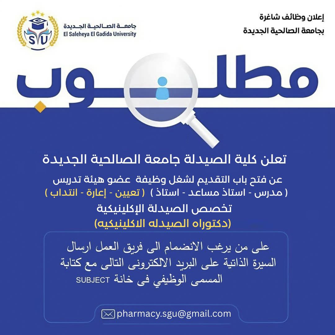وظيفة جامعة .. أعلنت جامعة الصالحية الجديدة عن فتح باب التقديم لشغل وظائف أعضاء هيئة تدريس في قسم الصيدلة الإكلينيكية للعام الأكاديمي الجديد 2025، وذلك بنظام الإعارة أو التعيين أو الندب.