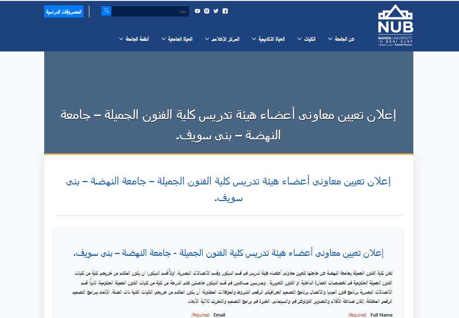 وظيفة جامعة .. في إطار سعيها لتعزيز الكوادر الأكاديمية ودعم العملية التعليمية بأعضاء هيئة تدريس مؤهلين، أعلنت جامعة النهضة بمحافظة بني سويف عن توفر فرص عمل أكاديمية متميزة بكلية الفنون الجميلة، تشمل تعيين معاوني أعضاء هيئة التدريس (مدرسين مساعدين ومعيدين) في عدد من التخصصات الحيوية، وذلك وفقًا للشروط والمعايير الأكاديمية المعلنة.