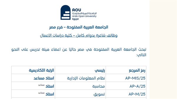وظيفة جامعة.. الجامعة العربية المفتوحة تعلن وظائف أعضاء هيئة التدريس 2025.. سجل هنا