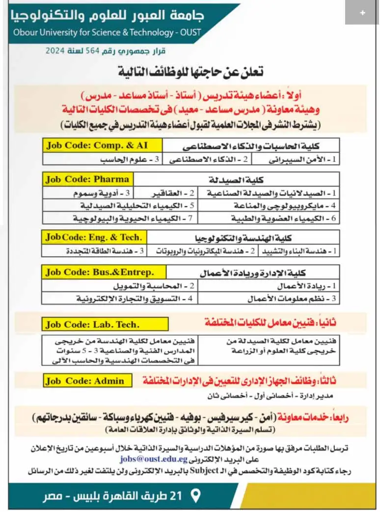 التخصصات المطلوبة في وظائف جامعة العبور للعلوم والتكنولوجيا