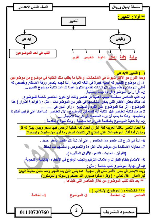 مراجعات نهائية في مقرر الفصل الدراسي الثاني اللغة العربية الشهادة الاعدادية