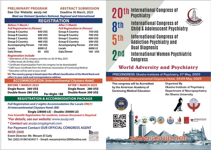 تنظم جامعة عين شمس عبر قسم طب المخ والأعصاب والطب النفسي بالتعاون مع مركز عكاشة للطب النفسي المؤتمر الدولي العشرين للطب النفسي، الذي يعد من أبرز فعاليات الطب النفسي العام في مصر والمنطقة. يشمل المؤتمر أيضًا المؤتمر الدولي الثامن لطب نفس الأطفال والمراهقين، والمؤتمر الدولي الخامس لطب نفس الإدمان والتشخيص المزدوج، بالإضافة إلى المؤتمر الدولي الثاني لطب نفس السيدات. يقام هذا الحدث الطبي العالمي في الفترة من 27 إلى 29 مايو تحت شعار "الشدائد العالمية والطب النفسي"، ويجمع نخبة من المتخصصين لمناقشة أحدث تقنيات علاج الاضطرابات النفسية والاضطرابات العصابية.