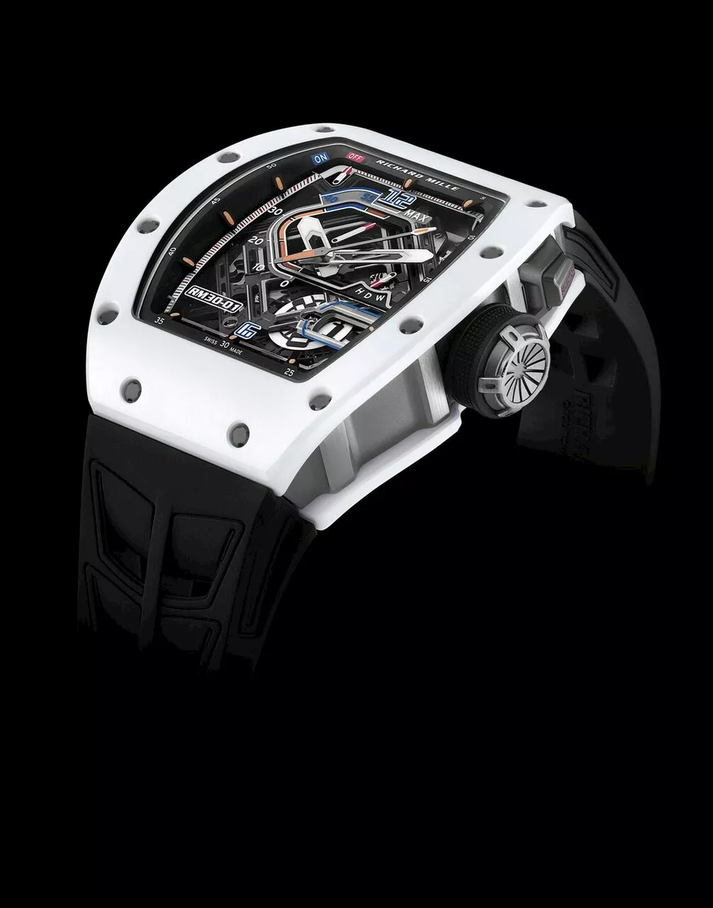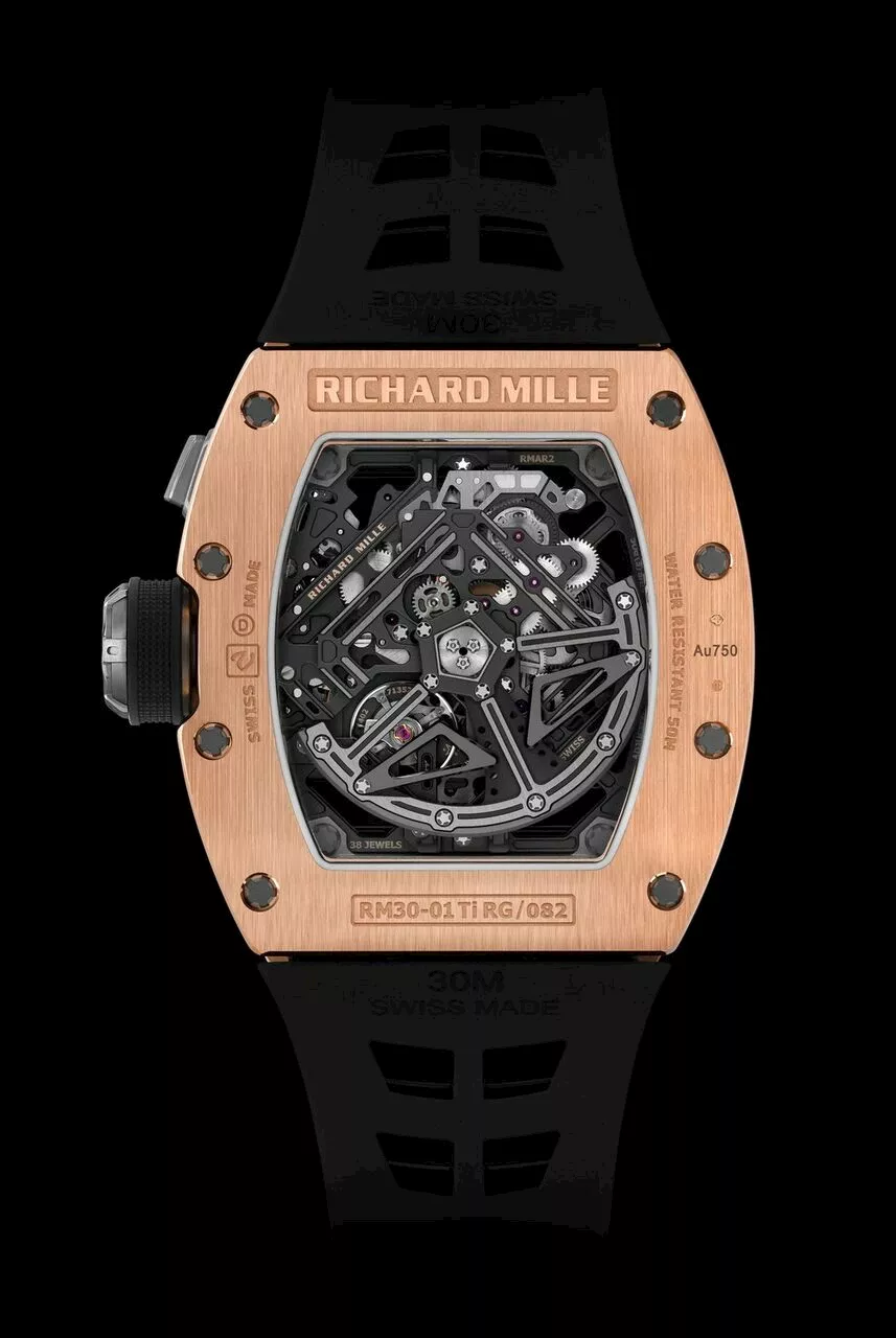 الساعة مصنوعة من التيتانيوم من الدرجة الخامسة، وهي مادة شديدة الصلابة ومقاومة للتآكل، مما يضمن سلاسة أداء التروس الداخلية، وتتكون بشكل أساسي من: