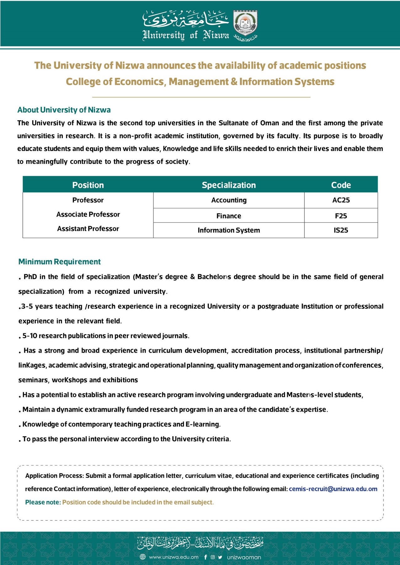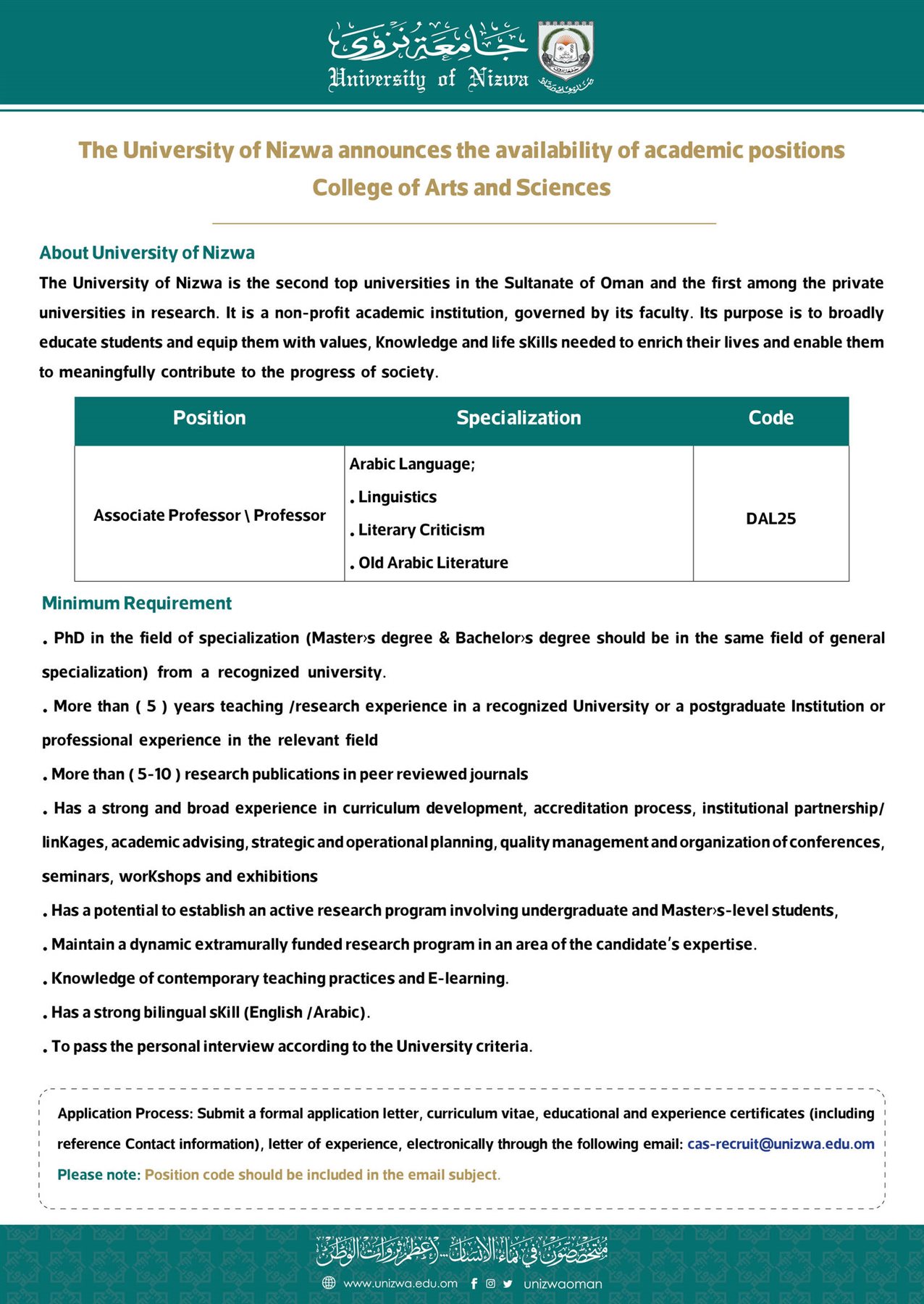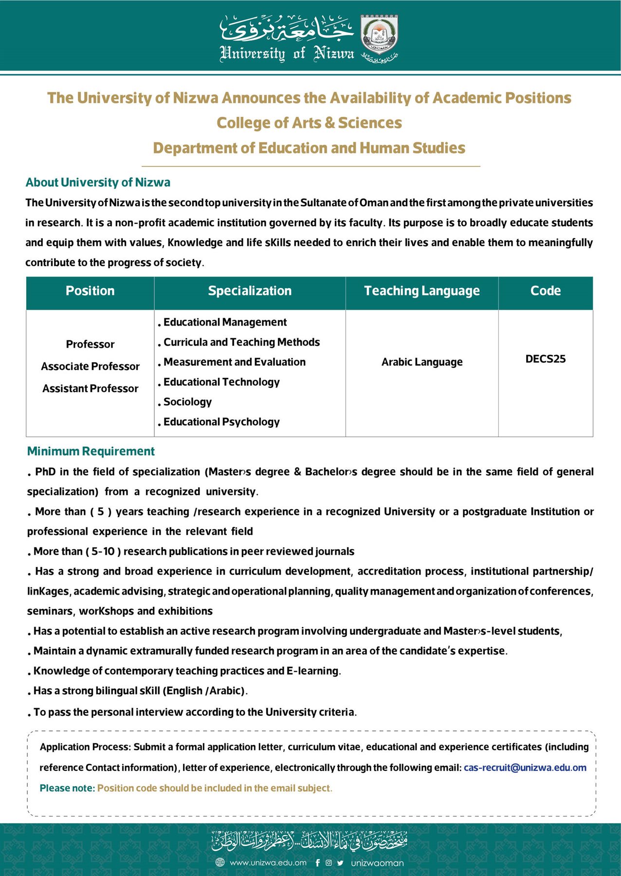 لمطالعة نص إعلان وظيفة جامعة نزوى والتقديم اضغط هنا