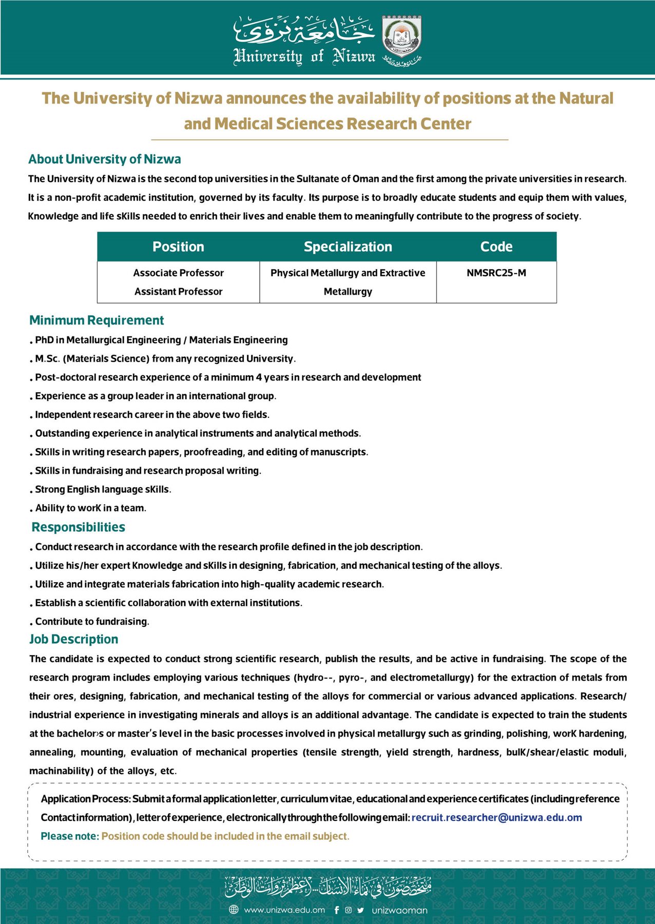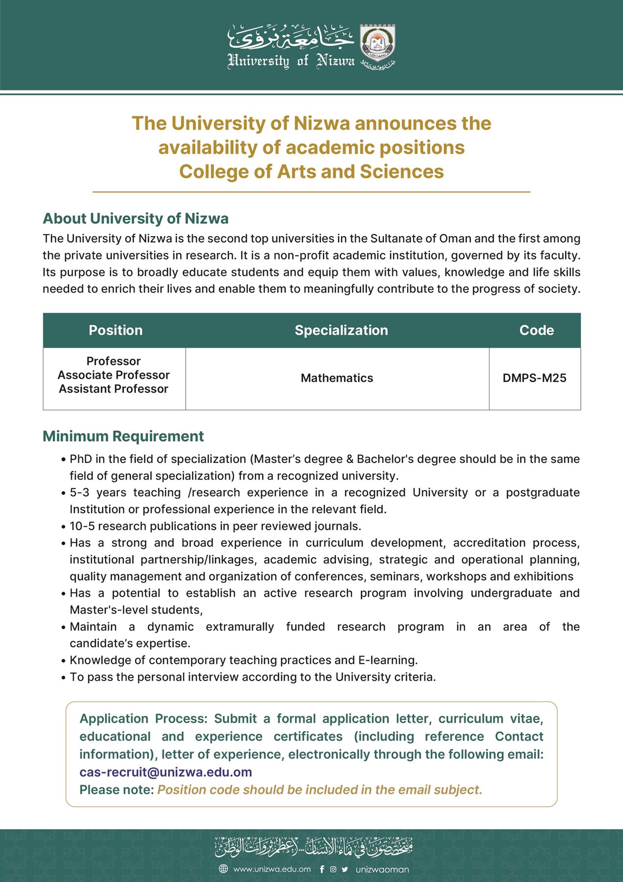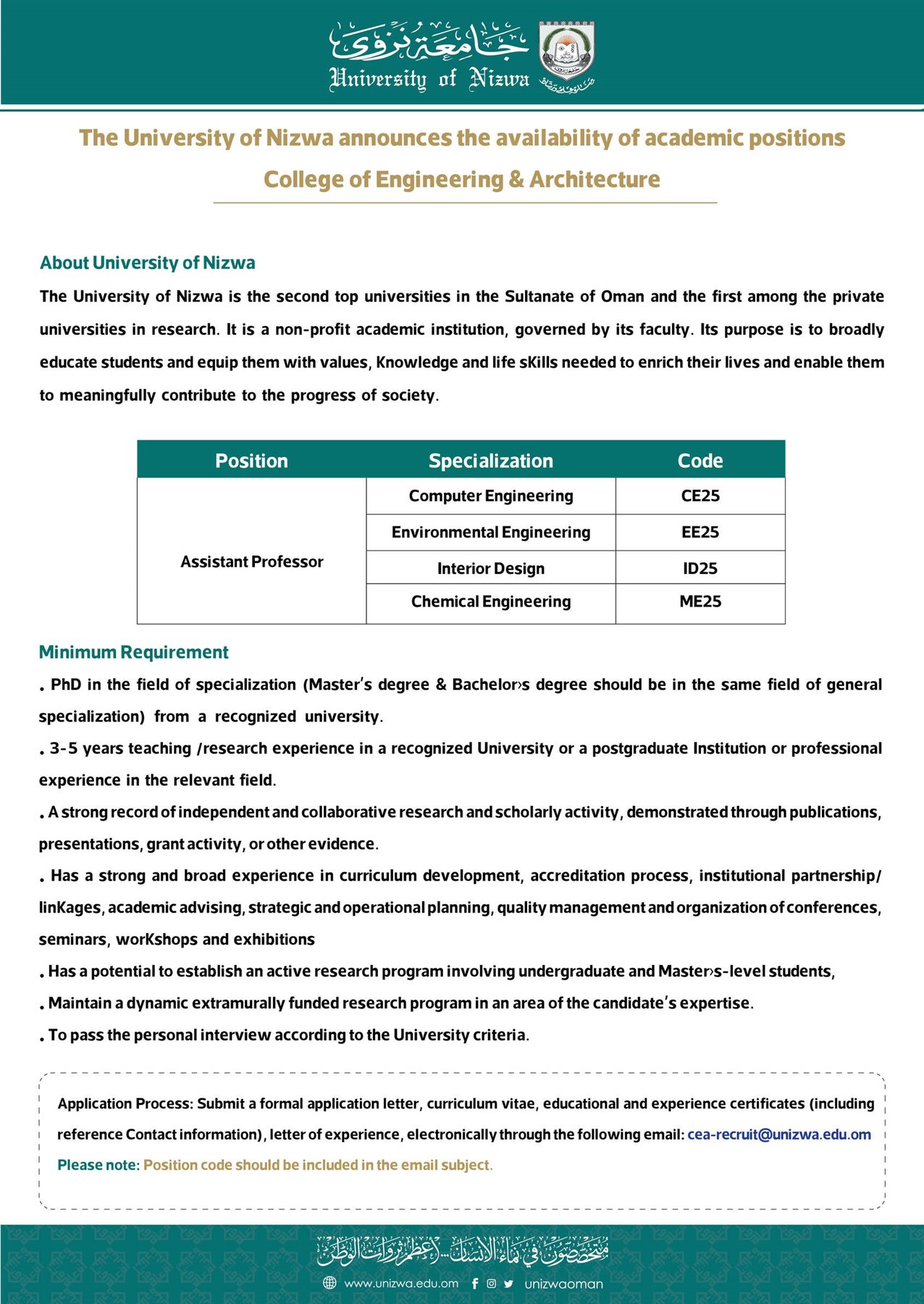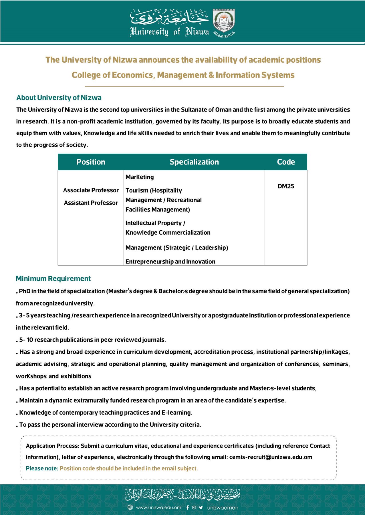 لمطالعة نص إعلان وظيفة جامعة نزوى والتقديم اضغط هنا