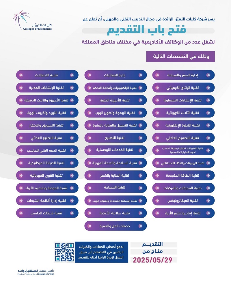 ما هي التخصصات المطلوبة في وظائف كليات التميز؟