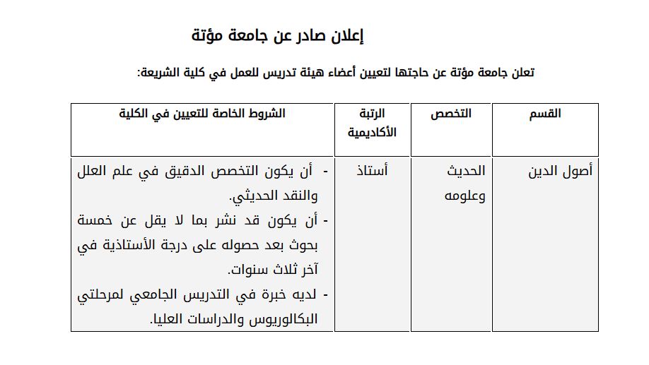 جامعة الصالحية الجديدة تعلن حاجتها إلى أعضاء هيئة التدريس.. التفاصيل كامله