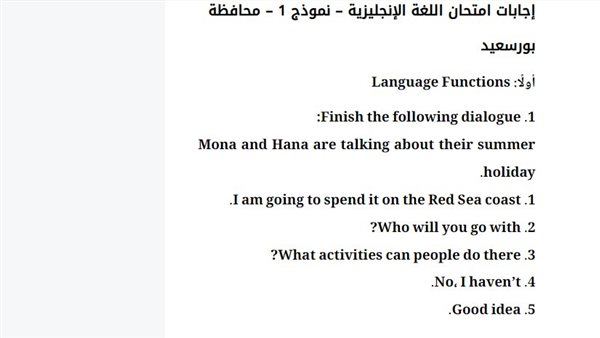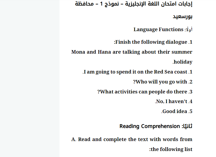 إجابات امتحان اللغة الإنجليزية – نموذج 1 – محافظة بورسعيد