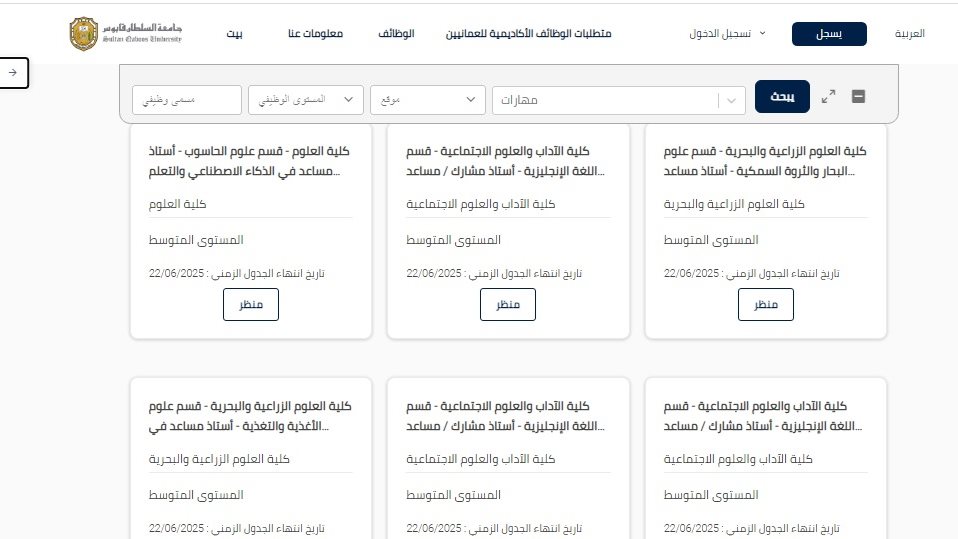 وتشمل الوظائف المطروحة مستويات أكاديمية متنوعة من درجة محاضر وحتى أستاذ، مع إعطاء أولوية في بعض التخصصات للمواطنين العمانيين، تماشيًا مع خطط التوطين والاستثمار في الكفاءات الوطنية.