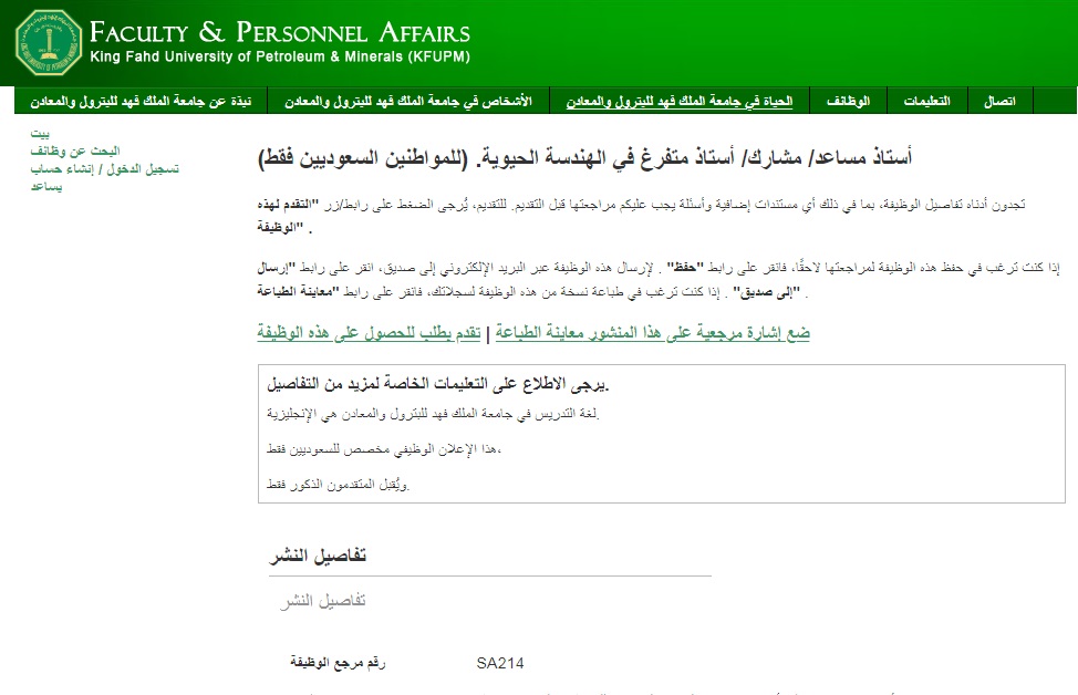 وظيفة جامعة .. أعلنت جامعة الملك فهد للبترول والمعادن (KFUPM)، وهي إحدى أعرق الجامعات في المملكة العربية السعودية والشرق الأوسط، عن توفر وظائف أكاديمية شاغرة في تخصص الهندسة الحيوية لحاملي درجة الدكتوراه من المواطنين السعوديين الذكور فقط.
