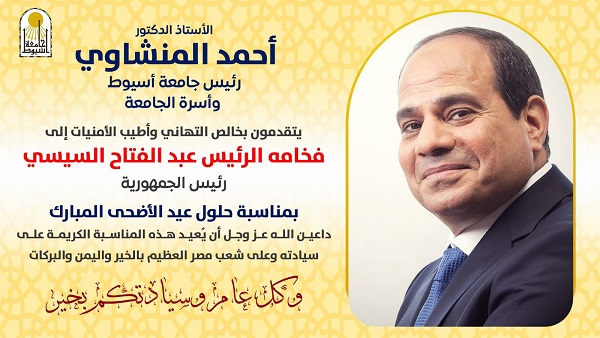 وجّه الدكتور أحمد المنشاوي، رئيس جامعة أسيوط، أسمى آيات التهاني القلبية إلى الرئيس عبد الفتاح السيسي، رئيس الجمهورية، بمناسبة عيد الأضحى المبارك 2025، معربًا عن فخر الجامعة بقيادته الحكيمة وما تحقق في عهده من أمن واستقرار لمصر.