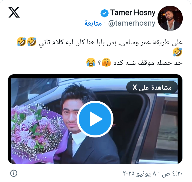 شارك الفنان تامر حسني جمهوره عبر صفحته الرسمية على فيسبوك مقطع فيديو طريفا لشاب يحاول مصالحة خطيبته على طريقة شخصية عمر، التي جسدها تامر في فيلمه الشهير “عمر وسلمى”.