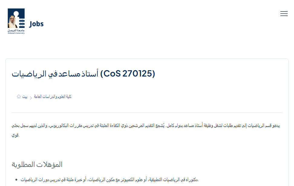 رابط التقديم الرسمي: https://jobs.alfaisal.edu/cos