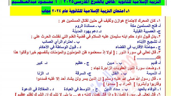- إجابة جميع امتحانات التربية الاسلامية في سنوات سابقة لـ الثانوية العامة