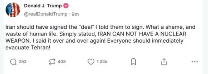 وختم ترامب منشوره برسالة تحذيرية مباشرة قائلًا:"على الجميع إخلاء طهران فورًا".