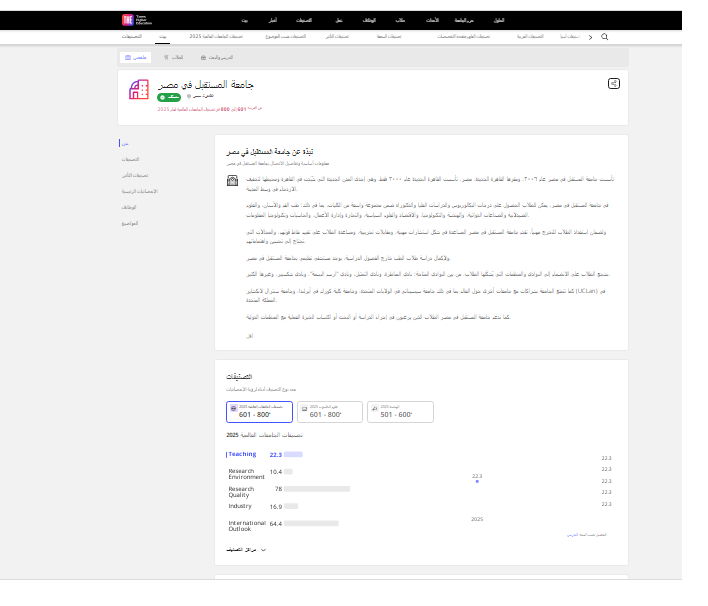 واستعرض التقرير التطور الذي حققته الجامعات المصرية في نتائجها خلال الأعوام 2023 و2025، حيث ارتفع عدد الجامعات المصرية المُدرجة بالتصنيف من 19 جامعة في نسخة التصنيف عام 2023 إلى 27 جامعة في تصنيف 2025، كما زاد عدد الجامعات المدرجة ضمن أفضل 1000 جامعة على مستوى العالم من 16 إلى 22 جامعة مقارنة بالعام الماضي، وبلغ متوسط التقدم الذي حققته الجامعات المصرية في التصنيف 100+ مركز نحو الأفضل، وهو ما يعكس التحسن الملموس في جودة الأداء البحثي والتعليمي للمؤسسات الأكاديمية المصرية.