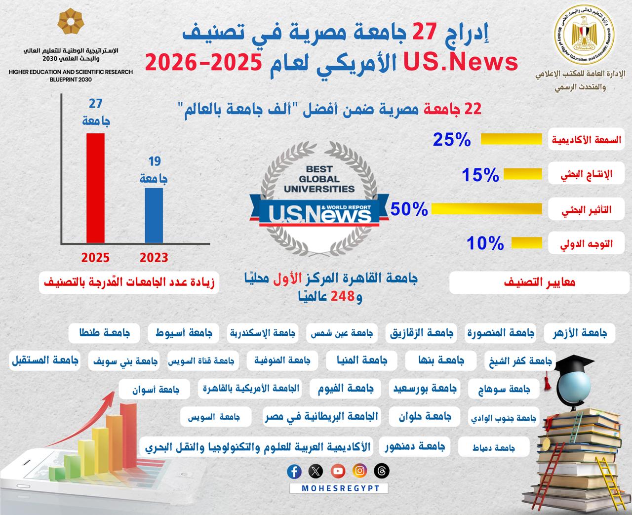 جدير بالذكر أن وزارة التعليم العالى والبحث العلمى قالت فى بيانها، أن تصنيف "U.S. News & World Report" والصادر عن مؤسسة Clarivate العالمية، نتائجه لأفضل الجامعات للعام الأكاديمي 2025–2026، حيث حققت الجامعات المصرية تقدمًا نوعيًا على مستوى عدد الجامعات المصنفة، وترتيبها العالمي، ومستوى الأداء البحثي، وذلك بإدراج 27 جامعة مصرية في نتائج التصنيف لهذا العام.