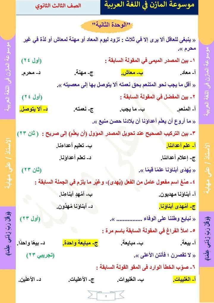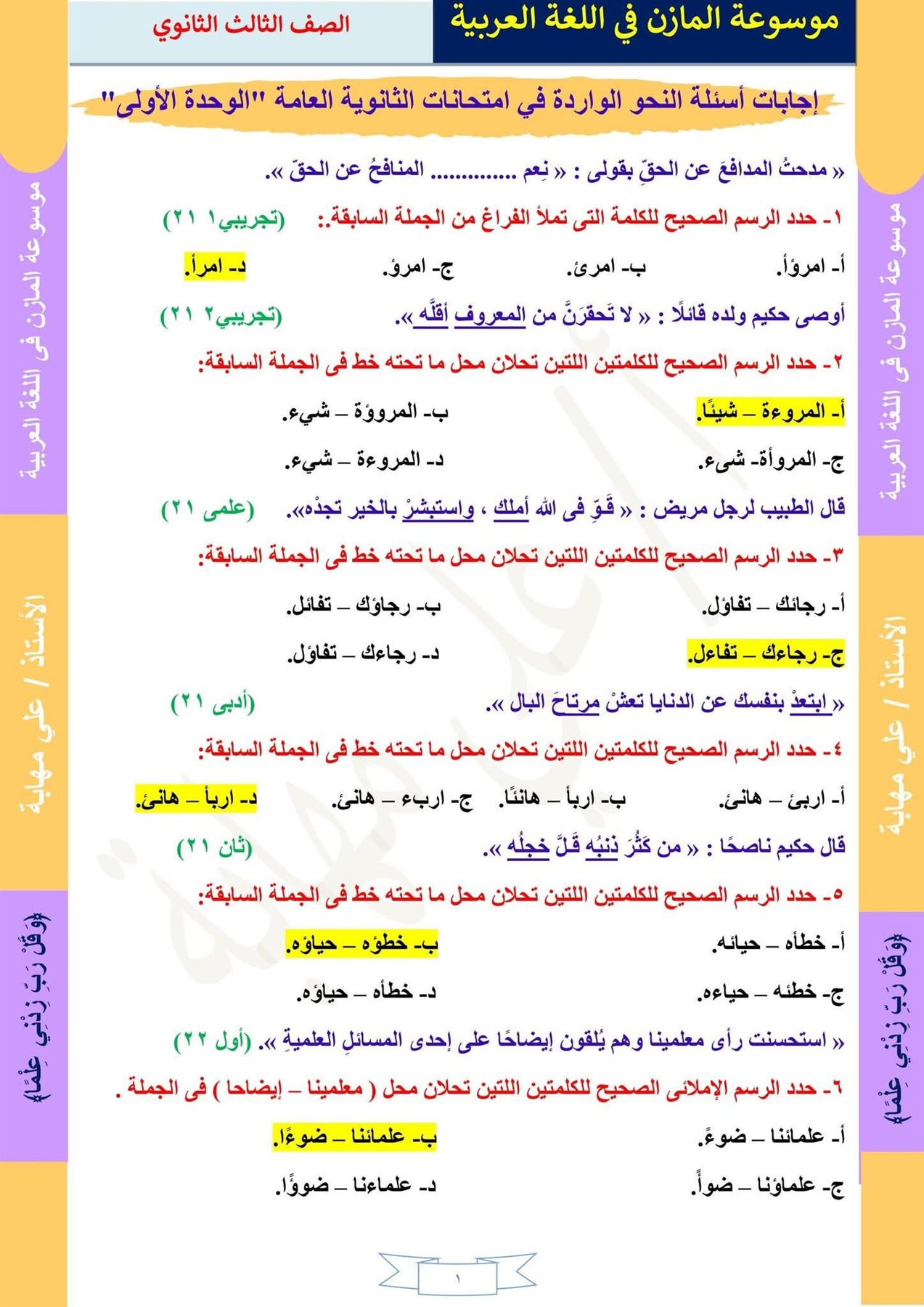 - أسئلة النحو الواردة في امتحانات الثانوية العامة عن الوحدتين الأولى والثانية بالاجابات الامتحان في جيبك