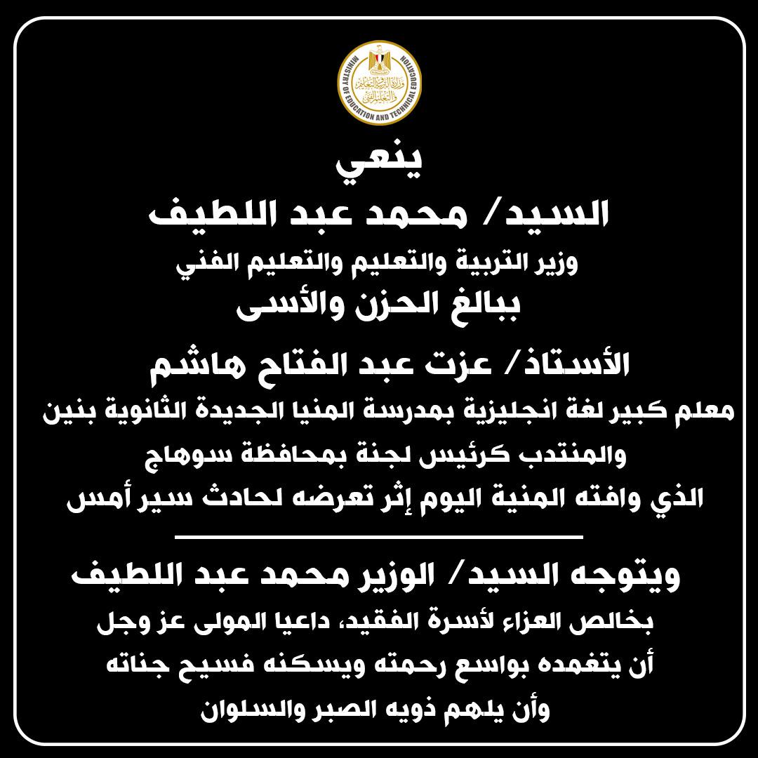 ببالغ الحزن والأسى، نعى الدكتور محمد عبد اللطيف، وزير التربية والتعليم والتعليم الفني، الأستاذ عزت عبد الفتاح هاشم، كبير معلمي اللغة الإنجليزية بمدرسة المنيا الجديدة الثانوية بنين، والذي وافته المنية صباح اليوم متأثرًا بإصابته في حادث سير أليم وقع أمس، أثناء تأديته لمهامه كرئيس لجنة امتحانات بمحافظة سوهاج.