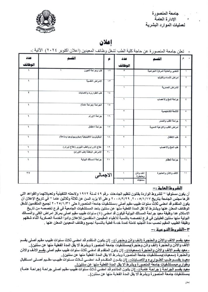 أن يكون مستوفيا " للشروط الواردة بقانون تنظيم الجامعات رقم ٤٩ لسنة ۱۹۷۲ ولائحته التنفيذية وتعديلاتهما والقواعد التي اقرها مجلس الجامعة بتاريخ ۲۰۰۵/۱/۱۷. ۲۰۰۸/۹/۲۹ وعلى ألا يزيد السن عن ثلاثة وثلاثين عاما " في تاريخ الإعلان أن يكون المتقدم قد امضي ثلاث سنوات طبيب مقيم أصلى بمستشفيات جامعة المنصورة حتى ٢٠٢٥/١/٣١ لجميع المتقدمين لشغل الوظائف المعلن عنها ويشترط ألا تقل المدة الفعلية منها عن سنتين باحد المستشفيات الجامعية في فرع تخصصه من تاريخ الاستلام عدا وظيفة معيد جراحة المسالك البولية فيكون قد امضى (٤) سنوات طبيب مقيم اصلي بمركز امراض الكلى والمسالك البولية منها سنتين فعليتين في فرع تخصصه بالنسبة للأطباء المقيمين المتقدمين للإعلان وأدوا الخدمة العسكرية أثناء شغلهم وظيفة الطبيب المقيم تحسب مدة التجنيد كاملة كمدة خدمة فعلية بالنسبة لجميع وظائف المعيدين المعلن عنها.