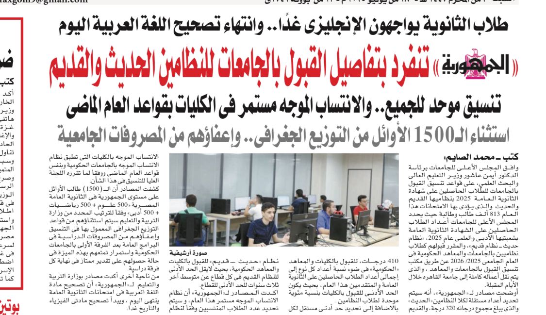 حيث يحدد المجلس الأعلى للجامعات أعداد الطلاب الحاصلين على الشهادة الثانوية العامة بشعبتيها الأدبي والعلمي عام 2025، "نظام حديث - نظام قديم "، والمقرر قبولهم كطلاب نظاميين بالجامعات والمعاهد الحكومية في العام الجامعي 2026\ 2025 عن طريق مكتب تنسيق القبول بالجامعات والمعاهد، والذى يتم نقل أعماله كاملة من جامعة عين شمس إلى جامعة القاهره خلال الأيام المقبلة.