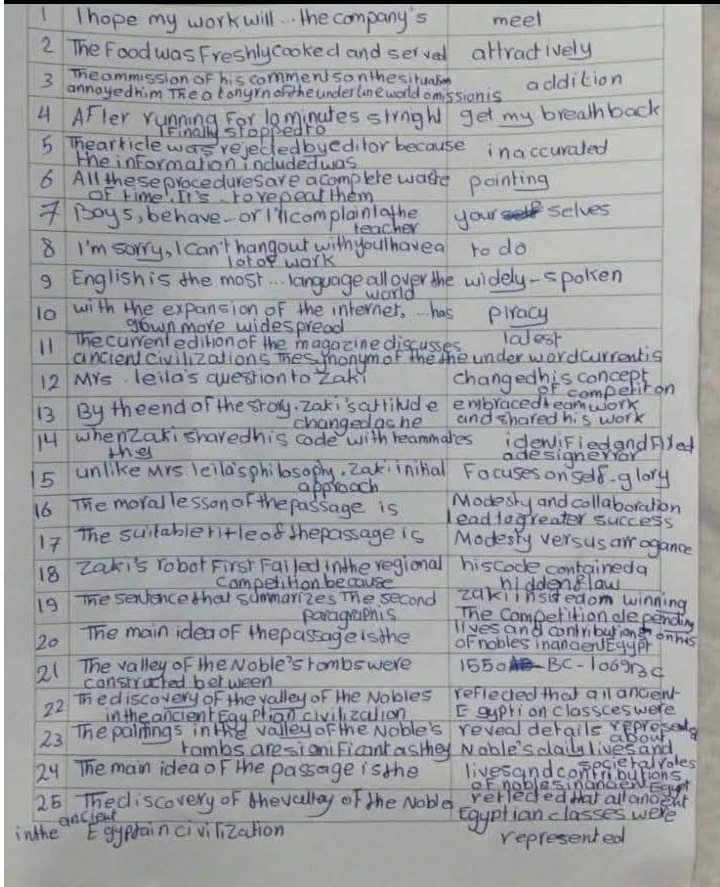 نموذج الاجابة الرسمي في امتحان اللغة الانجليزية لـ الثانوية العامة.. ومن المتوقع أن يساعد النموذج في توضيح الإجابات الصحيحة للطلاب ومقارنتها بما كتبوه داخل اللجان، ما يمنحهم فرصة لتقدير درجاتهم بدقة قبل إعلان النتيجة الرسمية.