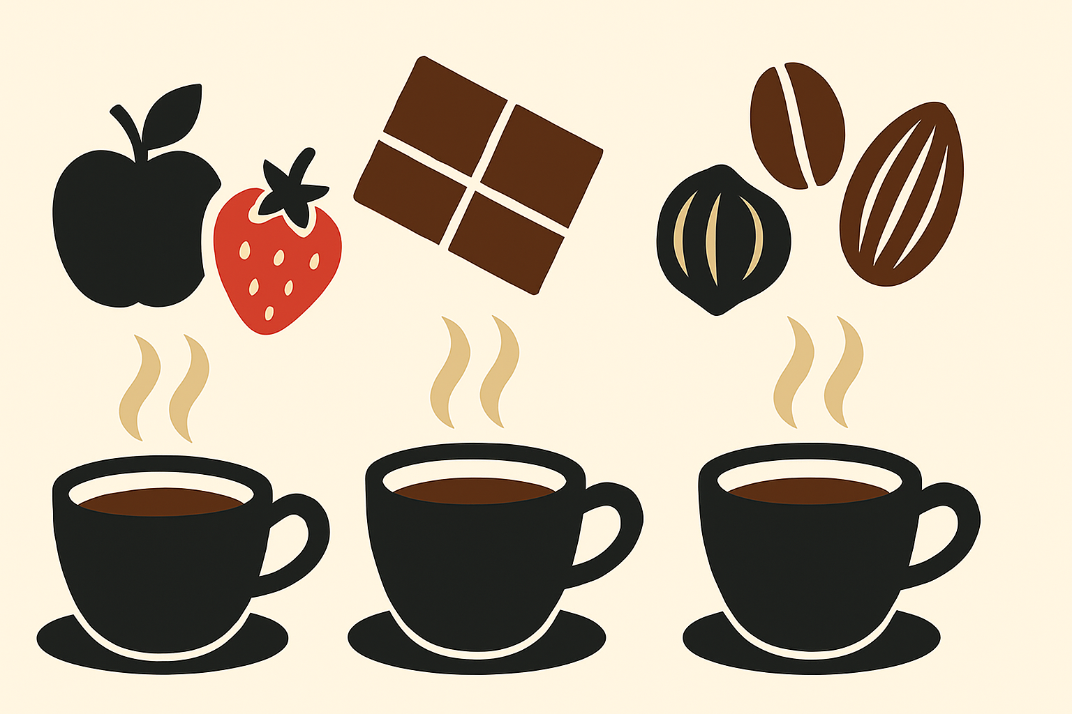 - الإيحاءات (Notes): هي التفاصيل الدقيقة داخل هذه القصة. عندما نقول إن القهوة بها "إيحاء الشوكولاتة"، فهذا لا يعني أننا أضفنا شوكولاتة إلى الكوب! بل يعني أن المركّبات الطبيعية في حبة البن تشبه تلك الموجودة في الشوكولاتة، فتستدعي هذه الذكرى في دماغك. الإيحاءات هي "شخصيات وأحداث" القصة.