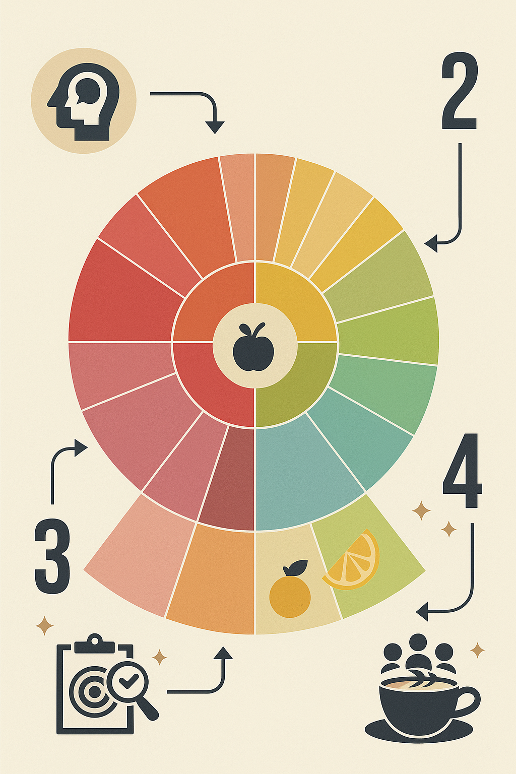 - كيف أستخدمها؟ تبدأ من الدائرة المركزية التي تحتوي على أوصاف عامة (مثل: فاكهي، مكسرات، توابل)، وكلما تحركت للخارج، أصبحت الأوصاف أكثر دقة وتحديدًا (مثلًا: فاكهي -> فواكه حمضية -> ليمون أو برتقال).