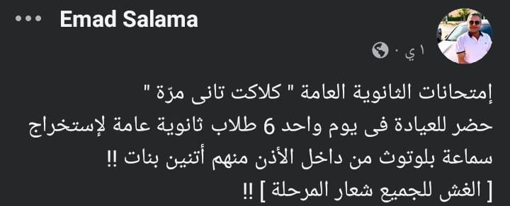 ونشر طبيب أنف وأذن شهير بأسيوط يدعي عماد سلامة وهو ينتقد غش الطلاب، قائلًا "جالي العيادة 6 طلاب ثانوية عامة عشان أخرج سماعات كانوا بيغشوا بيها".