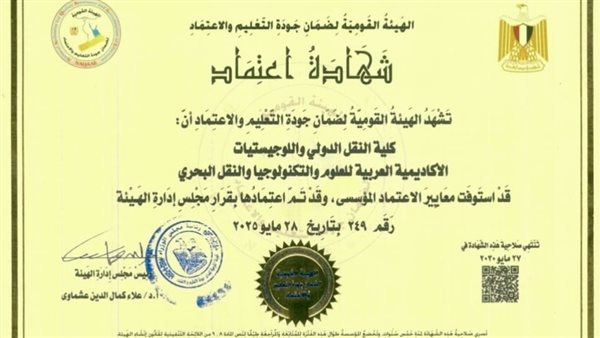 الهيئة القومية لضمان جودة التعليم تعتمد كلية النقل الدولي واللوجستيات بمقر الأكاديمية بأبي قير