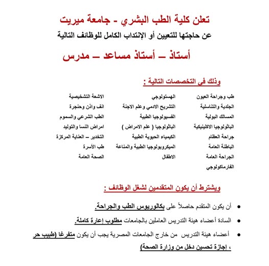 تعلن كلية الطب البشري، جامعة ميريت عن حاجتها للتعيين أو الإنتداب الكامل للوظائف التالية، أستاذ - أستاذ مساعد - مدرس، وذلك في التخصصات التالية: