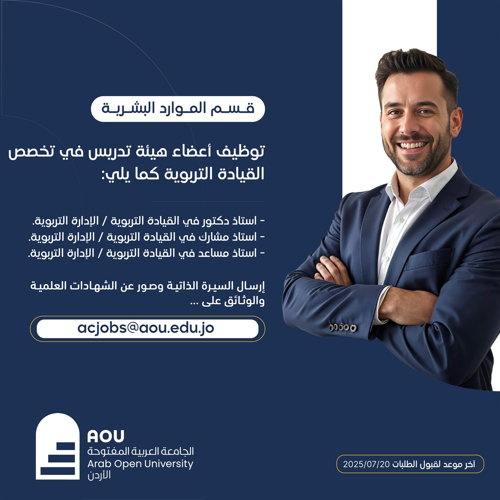 تعلن الجامعة العربية المفتوحة، بالمملكة الأردنية الهاشمية، عن حاجتها إلى أعضاء هيئة التدريس، من أستاذ دكتور وأستاذ مساعد وأستاذ مشارك، وعلى الراغبين في الحصول على وظائف الجامعة العربية المفتوحة، عليه التواصل من خلال شبكة الانترنت وموقع الجامعة العربية المفتوحة، والتقديم متاح الآن، علما بإن آخر موعد للتقديم على وظائف الجامعة العربية المفتوحة يوم 20-7-2025.