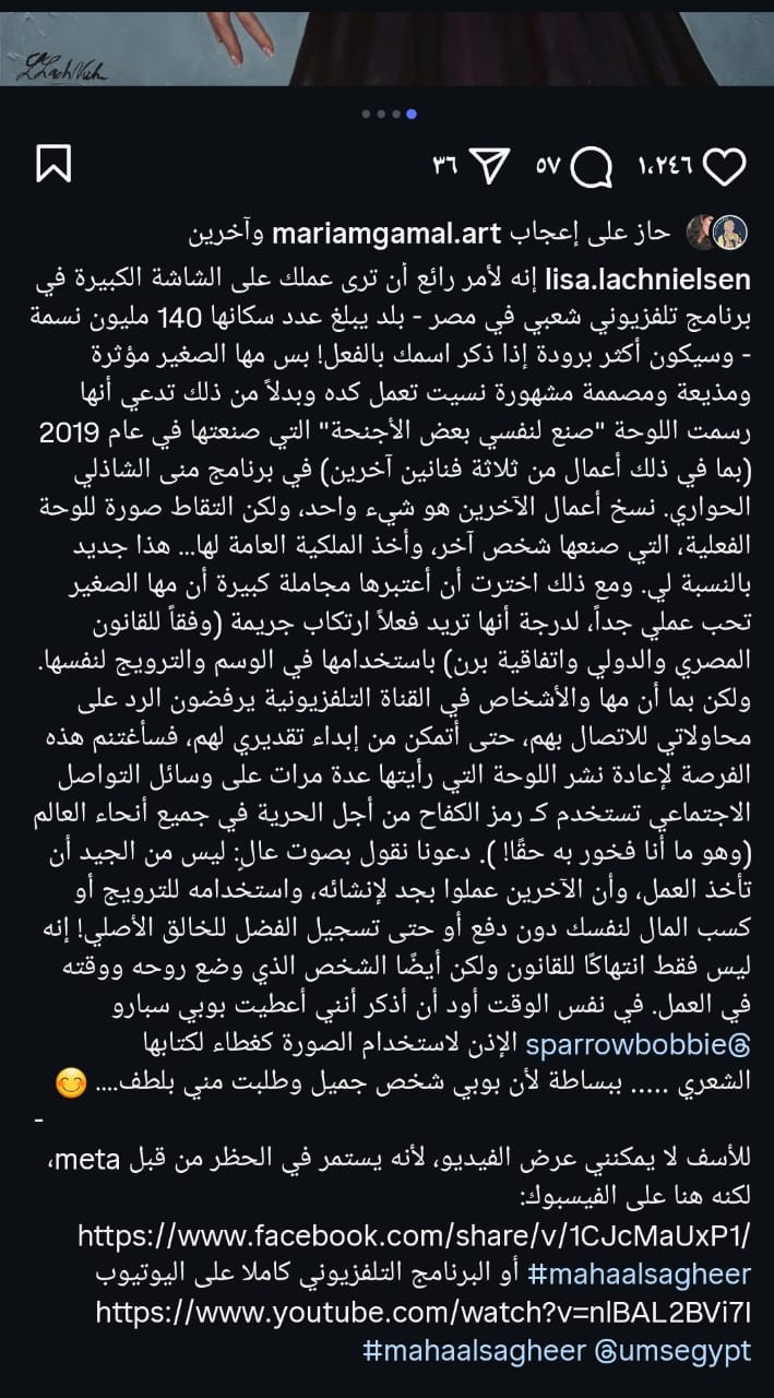 الإعلامية مها الصغير.. من جانبها، علّقت الفنانة ليزا لاش نيلسون عبر منشور على حسابها بـ"إنستغرام"، قائلة: "من الرائع أن أرى أعمالي على شاشة كبيرة في برنامج شهير في مصر، ولكن كان سيكون من الأفضل لو ذُكر اسمي. بدلًا من ذلك، نسبَت مها الصغير لوحتي المسماة صنعت لنفسي بعض الأجنحة، إلى جانب ثلاث لوحات أخرى، لنفسها".