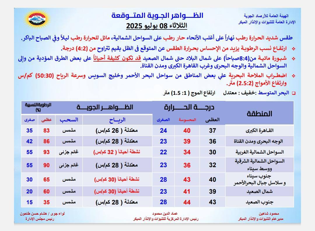 حالة الطقس المتوقعة اليوم الثلاثاء 8 يوليو 2025.. في ظل استمرار موجة ارتفاع شديد في حالة الطقس بشكل يومي، حيث كشفت الهيئة العامة للأرصاد الجوية عن حالة الطقس المتوقعة اليوم الثلاثاء في القاهرة والمحافظات.. ونشهد طقس شديد الحرارة رطب خلال ساعات النهار، حار رطب ليلا على معظم الأنحاء.