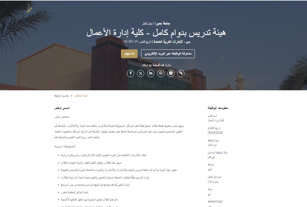 لمطالعة التخصصات المطلوبة في وظيفة جامعة جميرا والتقديم عبر الرابط الرسمي اضغط هنا