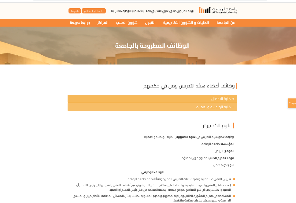 فيما يلي التخصصات الأكاديمية المطلوبة للوظائف المتاحة ضمن كلية الهندسة والعمارة بجامعة اليمامة: