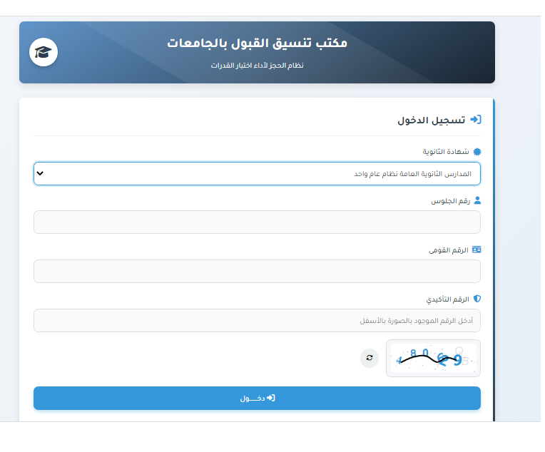. يقوم الطالب ببدء عملية التسجيل لأداء اختبارات القدرات وذلك باستخدام الرقم القومي ورقم الجلوس الخاص بالطالب.