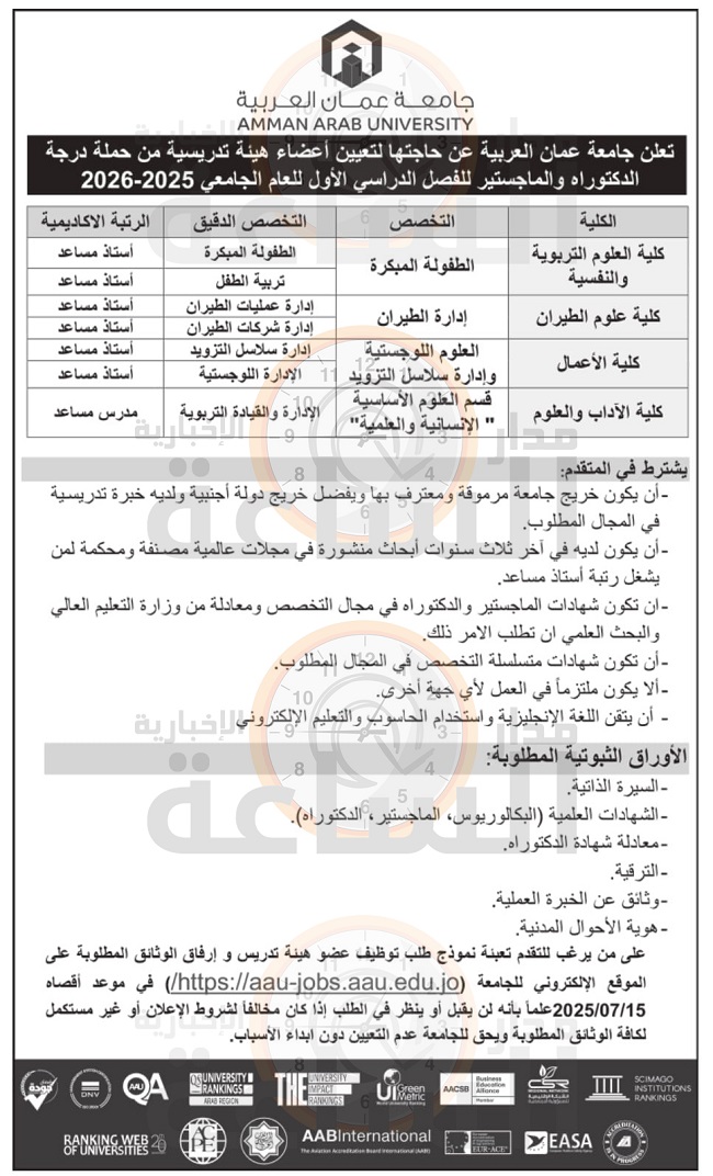 على من يرغب للتقدم تعبئة نموذج طلب توظيف عضو هيئة تدريس وإرفاق الوثائق المطلوبة على https://aau-jobs.aau.edu.jo الموقع الإلكتروني لـ جامعة عمان العربية، في موعد أقصاه 2025/07/15 علما بأنه لن يقبل أو ينظر في الطلب إذا كان مخالفًا لشروط الإعلان أو غير مستكمل لكافة الوثائق المطلوبة ويحق لـ جامعة عمان العربية عدم التعيين دون ابداء الأسباب.