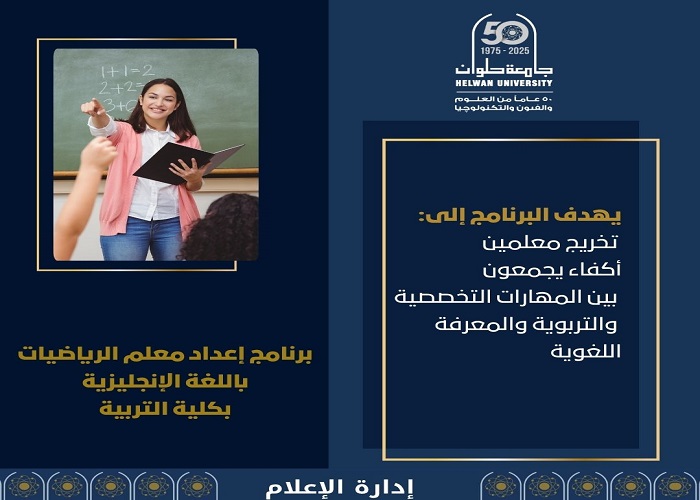 توفر جامعة حلوان فرصة مميزة لطلاب الثانوية العامة الشعبة العلمية الراغبين في التميز، من خلال برنامج إعداد معلم الرياضيات باللغة الإنجليزية للمرحلتين الإعدادية والثانوية، وهو برنامج نوعي يعمل بنظام الساعات المعتمدة داخل كلية التربية جامعة حلوان.