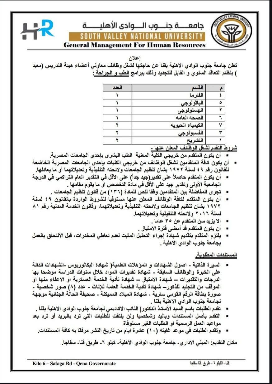 - فرص عمل جامعة جنوب الوادي الأهلية