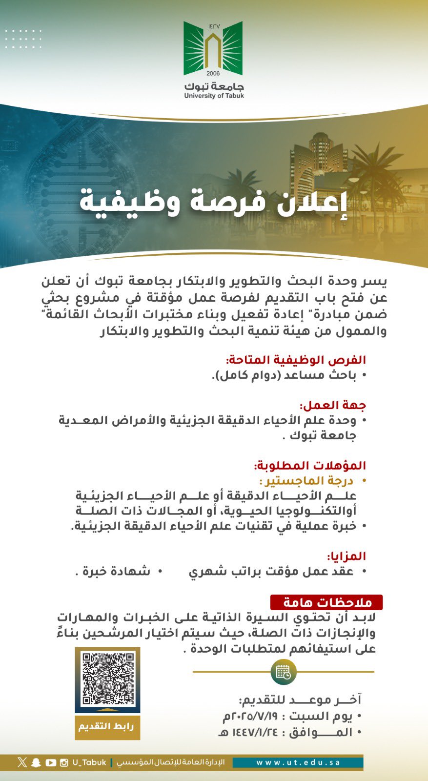 - التقديم مُتاح حاليًا وينتهي التقديم يوم السبت بتاريخ 1447/01/24هـ الموافق 2025/07/19م.