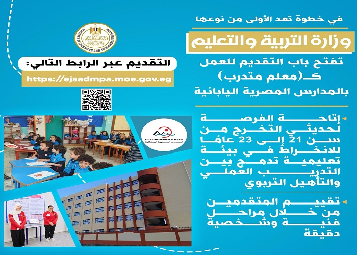 - التعليم تفتح باب التقديم للعمل كمعلم متدرب بـ المدارس المصرية اليابانية لإعداد كوادر تعليمية شابة ومؤهلة.