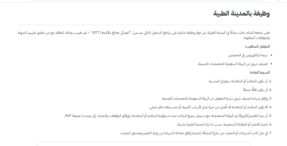 في إطار سعيها المستمر لتطوير الكوادر الطبية المتخصصة، أعلنت جامعة الملك خالد، ممثلةً في المدينة الطبية، عن توفر وظيفة شاغرة بنظام برنامج التشغيل الذاتي، وذلك بمسمى "أخصائي معالج بالأشعة (RTT)" – غير طبيب، حيث يتم التعاقد مع من تنطبق عليه الشروط والمؤهلات المطلوبة.