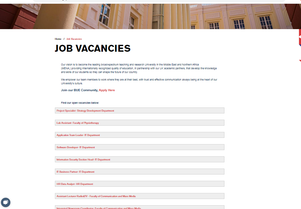 تضم قائمة الوظائف الشاغرة في الجامعة البريطانية بالقاهرة عددًا كبيرًا من الوظائف الأكاديمية في كليات الهندسة، وعلوم الحاسوب، والتمريض، والإعلام، والقانون، والعلاج الطبيعي، بالإضافة إلى وظائف إدارية متخصصة في مجالات تكنولوجيا المعلومات، الموارد البشرية، شؤون الطلاب، التسويق، والخريجين.
