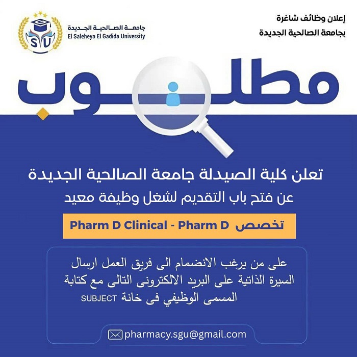 تعلن كلية الصيدلة بجامعة الصالحية الجديدة عن حاجتها لشغل وظيفة معيد وذلك في التخصصات التالية: