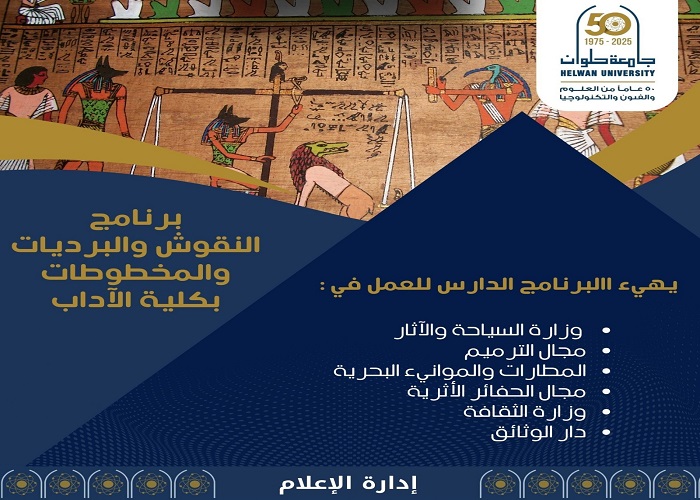 أطلقت جامعة حلوان من خلال كلية الآداب برنامجًا أكاديميًا فريدًا بعنوان "النقوش والبرديات والمخطوطات"، يستهدف الطلاب الشغوفين بدراسة التراث الإنساني وتحليل الوثائق القديمة والنصوص التاريخية، في ظل طلب متزايد على تخصصات التراث والآثار محليًا ودوليًا.