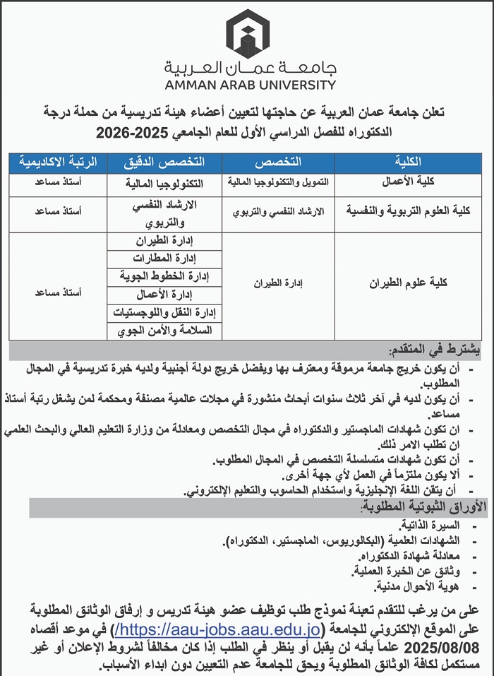 وعلى الراغبين في الحصول على وظائف جامعة عمان العربية، الدخول على موقع جامعة عمان العربية عبر شبكة الانترنت، والتقديم متاح الآن عبر الرابط التالي.. اضغط هنااااااااااااااا.. على من يرغب للتقدم تعبئة نموذج طلب توظيف عضو هيئة تدريس وإرفاق الوثائق المطلوبة في موعد أقصاه 8-8-2025، على الموقع الإلكتروني للجامعة.. اضغط هناااااااا.. علمًا بأنه لن يقبل أو ينظر في الطلب إذا كان مخالفًا لشروط الإعلان أو غير مستكمل لكافة الوثائق المطلوبة ويحق للجامعة عدم التعيين دون ابداء الأسباب.