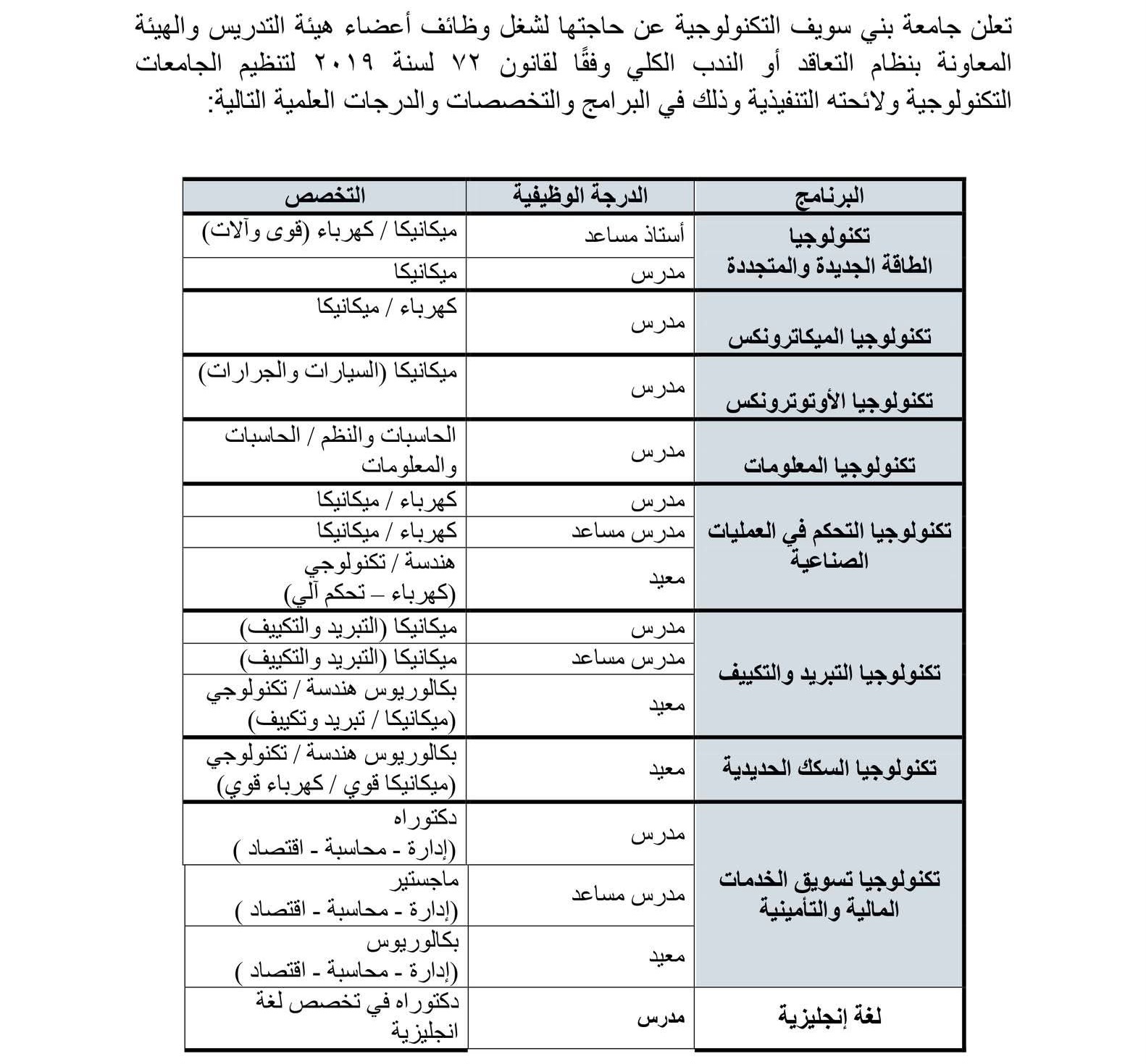 التخصصات المطلوبة في وظائف جامعة بني سويف التكنولوجية